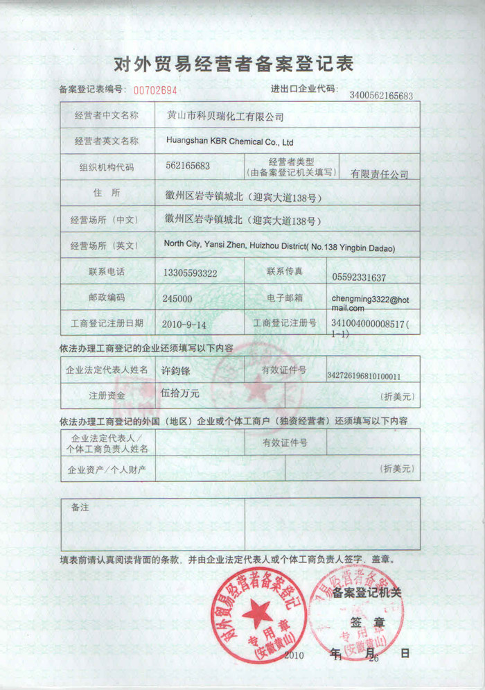 手機:18955921600 傳真:0086-559-2331637 總經理:許鈞鋒 郵箱:johnxu@kbrchem.com